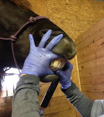 A whole horse assessment is conducted prior to dental work. As Certified Natural Balance Specialist, I have been trained to look at your horse from the outside and tell you what is going on with the teeth and body without even looking into the horse's mouth. We use special, natural horse handling techniques to help keep the horse calm. The horse is naturally positioned and allowed to put it's head low to the ground during the procedure. Specialists are also trained to work on their knees to follow the feel of the horse, enabling the horse to be in whatever position will make him most comfortable.